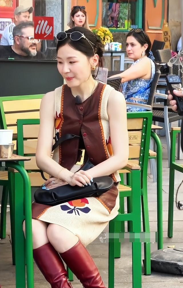穿着咖色系的套装,搭配同款长靴,“时尚女王”是让金靖拿捏住了。