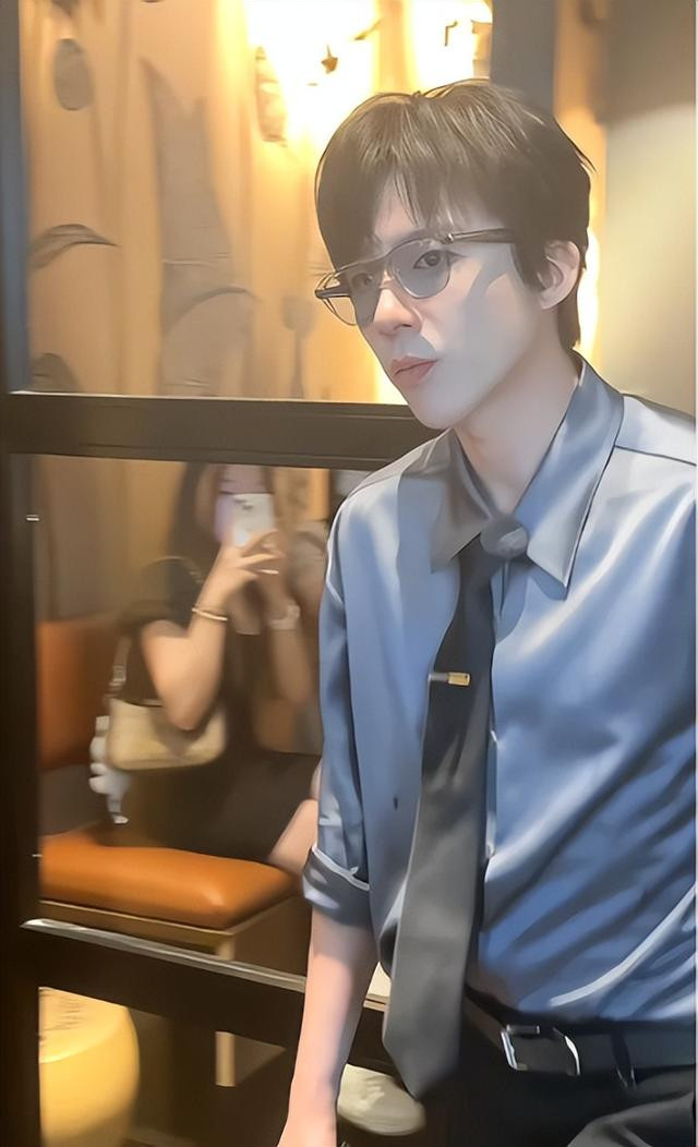 穿着蓝灰色的真丝衬衫,打着小领带,墨镜往鼻子上一架,有点“霸道总裁”那味儿了,攻气十足。