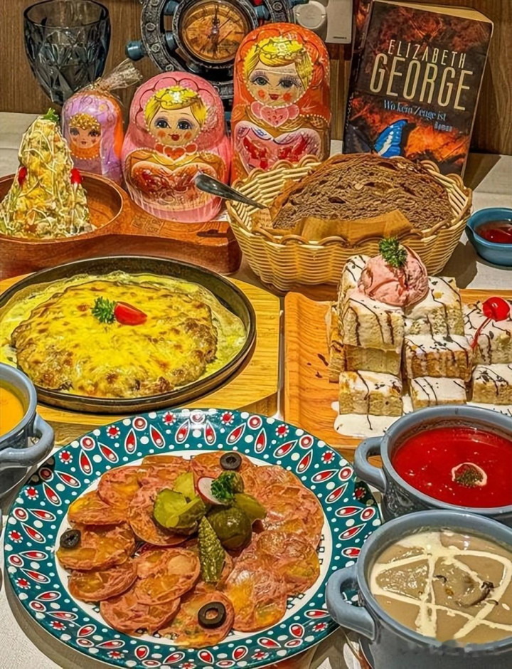 (1)红菜汤:这道菜是以甜菜根熬制而成,搭配酸奶油。整体口感酸甜,十分开胃;