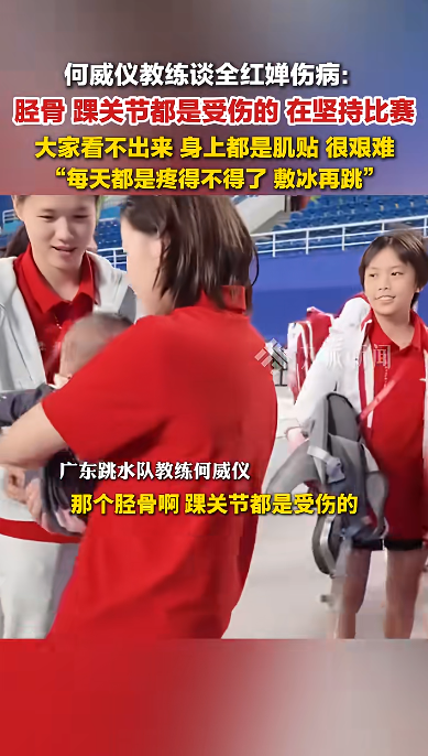 广东队教练何威仪表示,她是带伤参赛:“全红婵现在的胫骨,踝关节都是受伤的,在坚持比赛,大家看不出来的,其实她的大包小包的身上都是肌贴,她是很艰难很艰难的,每天都是疼得不得了,敷冰,起跳,再起跳。”