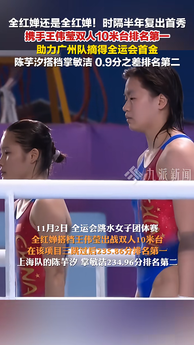 此前,11月2日晚,第十五届全国运动会跳水项目将拉开帷幕,全红婵搭档王伟莹参加女子团体双人10米跳台决赛。这也是时隔5个月,全红婵再次参加正式比赛。