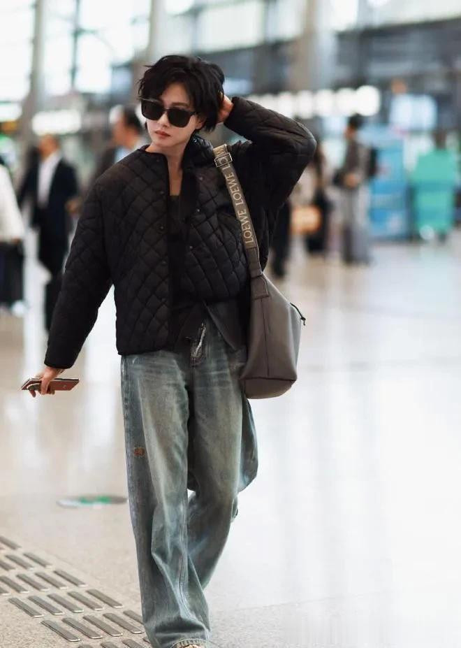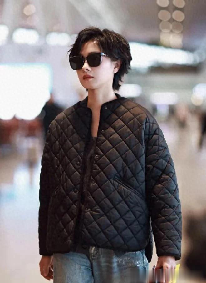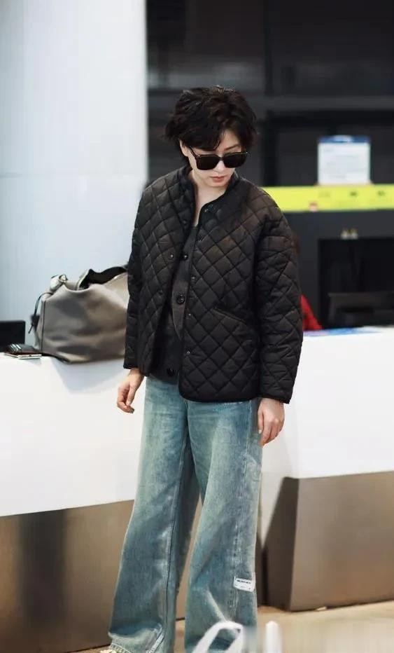 > 万茜新烫了微卷短发气质大变! 穿菱格棉夹克+牛仔裤, 时髦又洋气