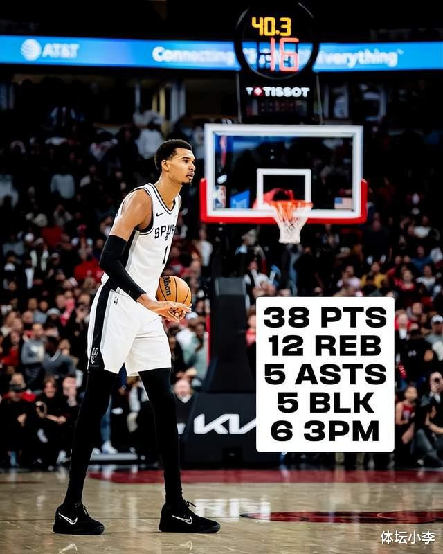 本场比赛文班亚马出战36分钟,投篮19中11,三分9中6,罚球10中10,砍下38分12篮板5助攻1抢断5盖帽。这也让他成为NBA历史上首位单场砍下至少35分10篮板5助攻5盖帽,且投进5+三分的球员。不得不说,一旦让文班亚马进入节奏,那真的是防不住,首先是他的出手高度是防守球员无法阻挡的。